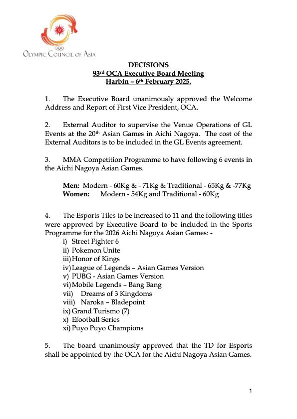 委員會還一致決定解散由OCA任命的、負責確定2026年愛知名古屋亞洲運動會電子競技項目的工作組(Task Force),因為電子競技項目已由OCA執行委員會批準。
